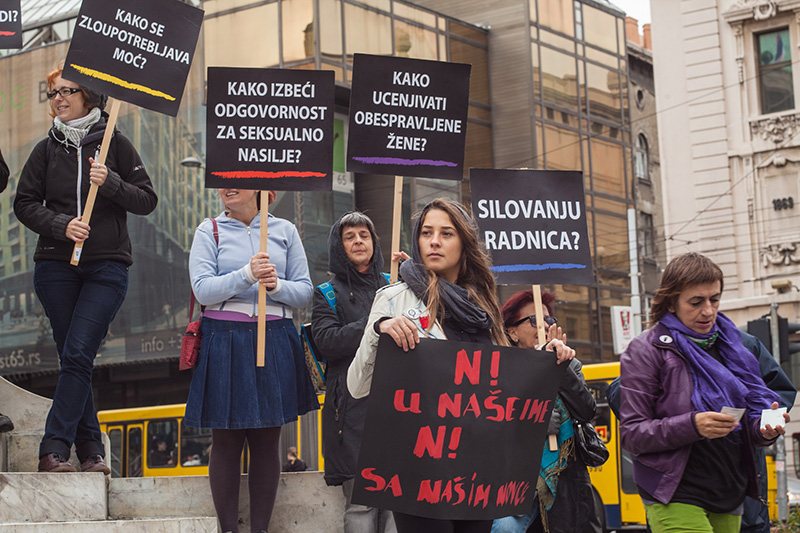 U protestnoj akciji, aktivistkinje ženskih grupa su transparentnima podsetile na kompleksnost nasilja nad ženama kao društvenog fenomena. Istovremeno, da je Vlada Srbije izborom seksualnog nasilnika ya savetnika, pokazala dubok prezir prema polovini građanstva Srbije, a to su žene, kao i dubok prezir prema radnicama, imigrantkinjama i svim drugim obespravljenim ženama.