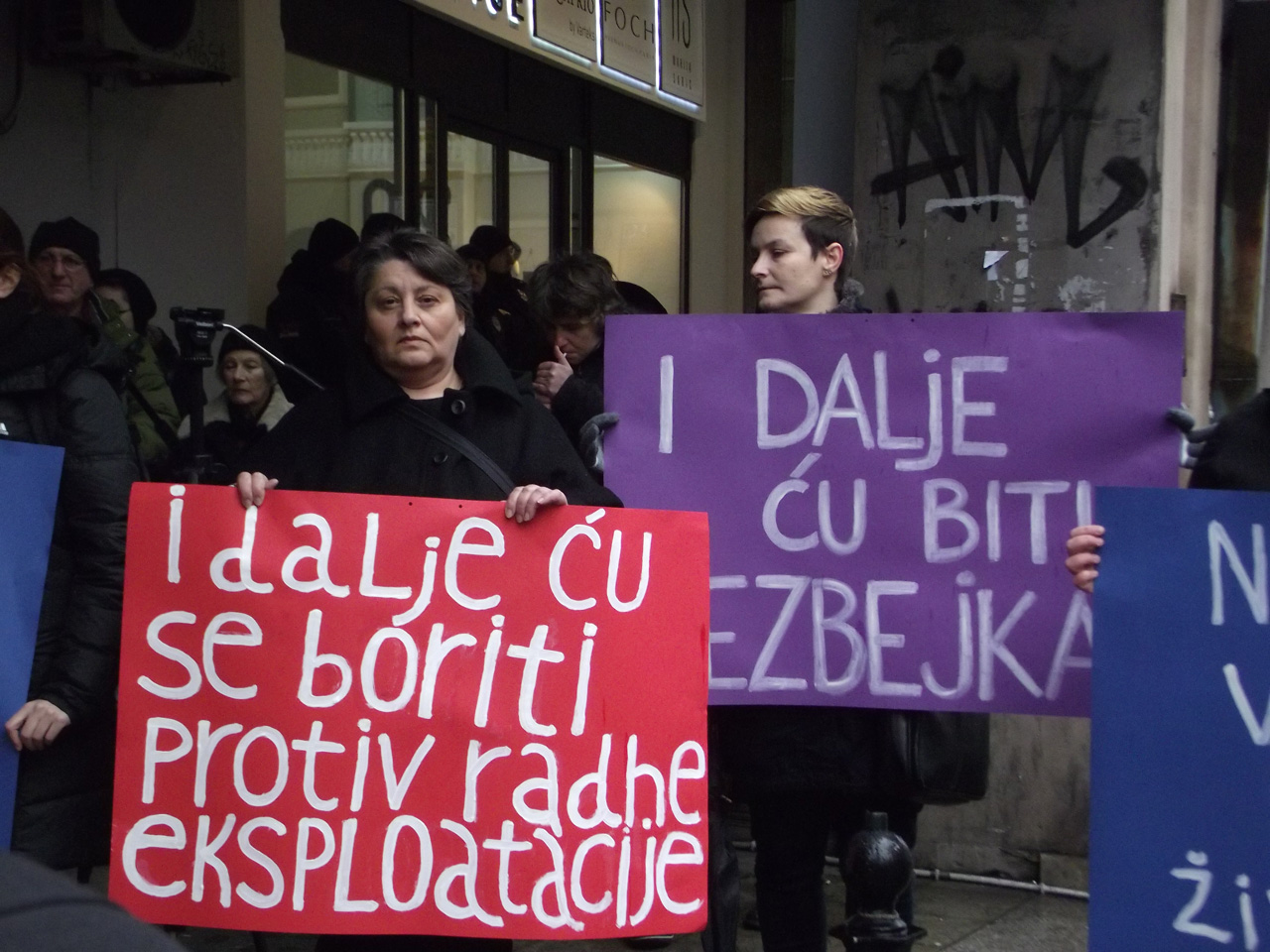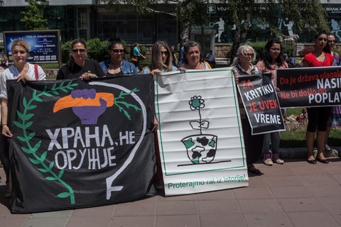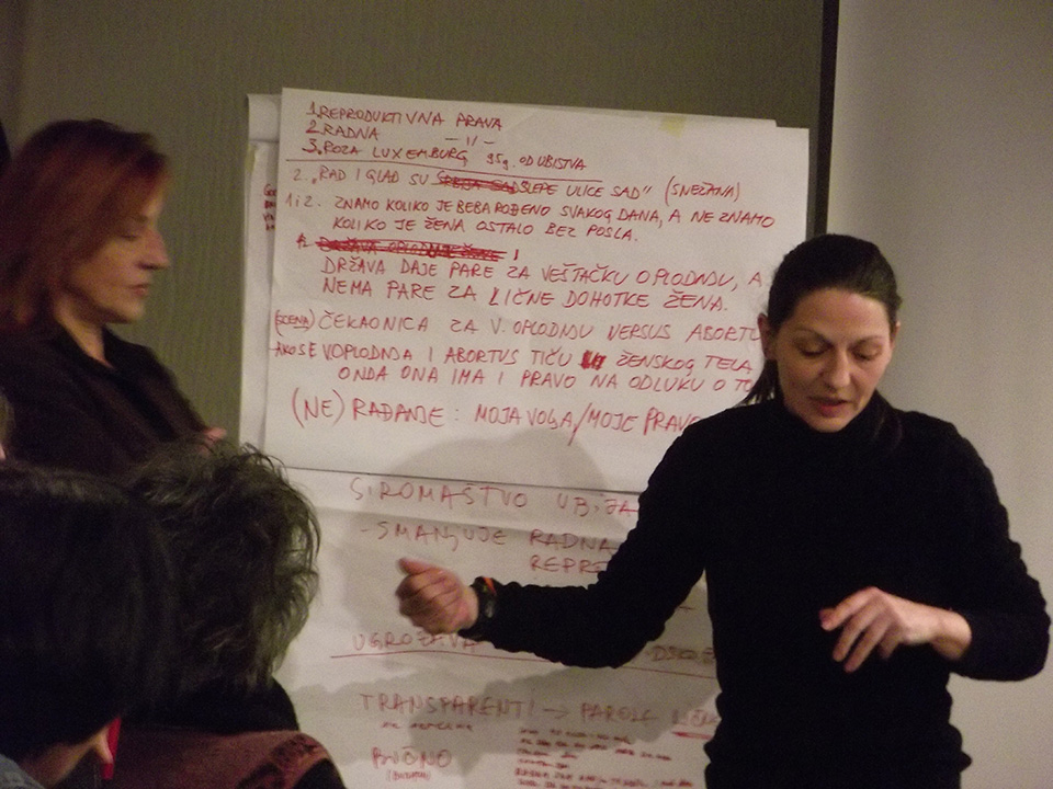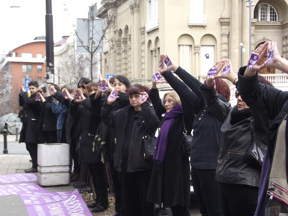 Protestom ukazujemo na ugrožavanje radnih prava žena u Srbiji (manje plaćene, prve otpuštene i dvostruko opterećene), kao i na poguban uticaj patrijarhata, crkve i pojedinih zakona na ženska reproduktivna prava.