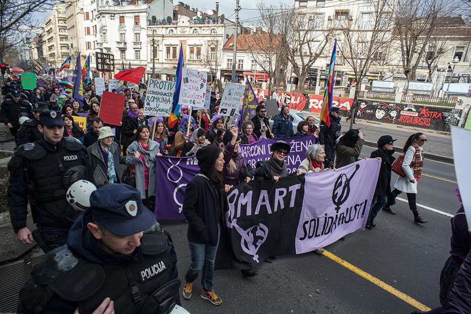 Povodom 8. marta – Međunarodnog dana žena Mreža Žena u crnom i Rekonstrukcija ženski fond, organizovale su ulični marš od Trga Republike, preko Slavije, do Centra za kulturnu dekontaminaciju.