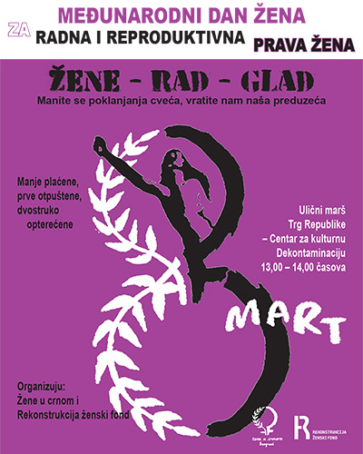 Povodom 8 marta – Međunarodnog dana žena Mreža Žena u crnom i Rekonstrukcija ženski fond, organizuju ulični marš od Trga Republike, preko Slavije, do Centra za kulturnu dekontaminaciju, u subotu 8 marta, sa početkom u 13 časova.