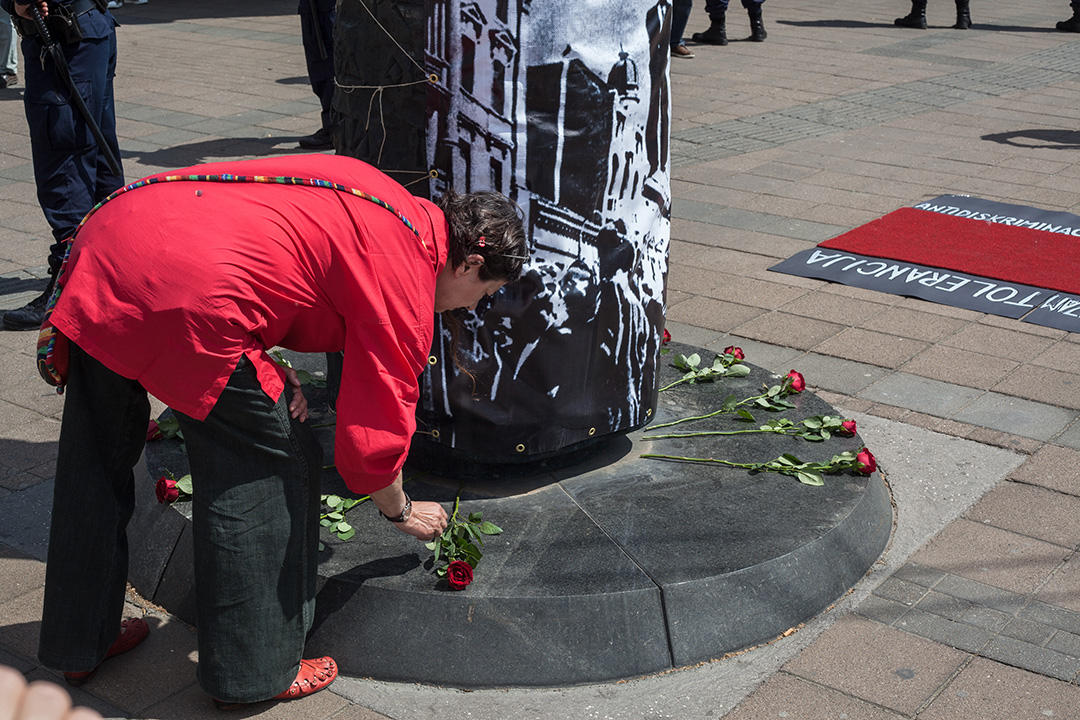 Tom prilikom ispred spomenika na kome piše Zašto i imena šesnaest imena ubijenih radnika, aktivistkinje Žena u crnom su položile venac na kome je pisalo Pamtimo Žene u crnom.