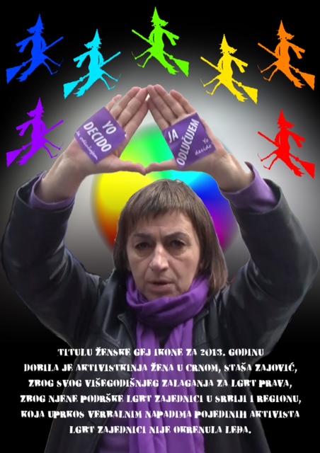 The title of the female gay icon for 2013 received the Women in Black, Staša Zajović, for her many years of advocacy for LGBT rights, for her support of the LGBT community in Serbia and the region, despite the verbal attacks of certain activists, she didn't turn her back to LGBT community.