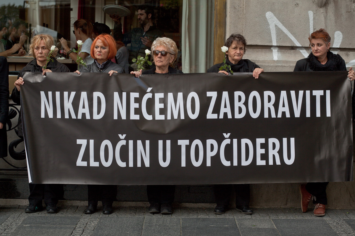 Na protestu je bilo oko 20 aktivistkinja i aktivista Žena u crnom, a na protestu su bili istaknuti sledeći transparenti...