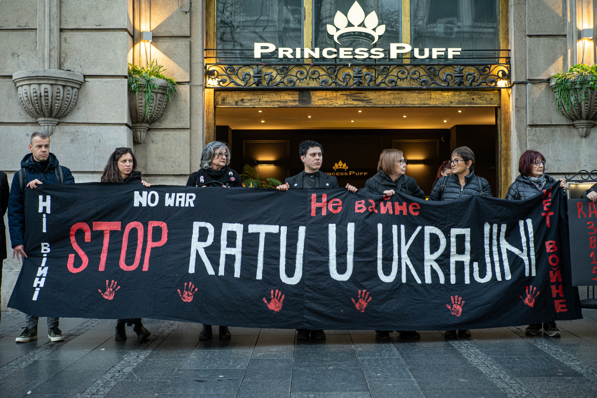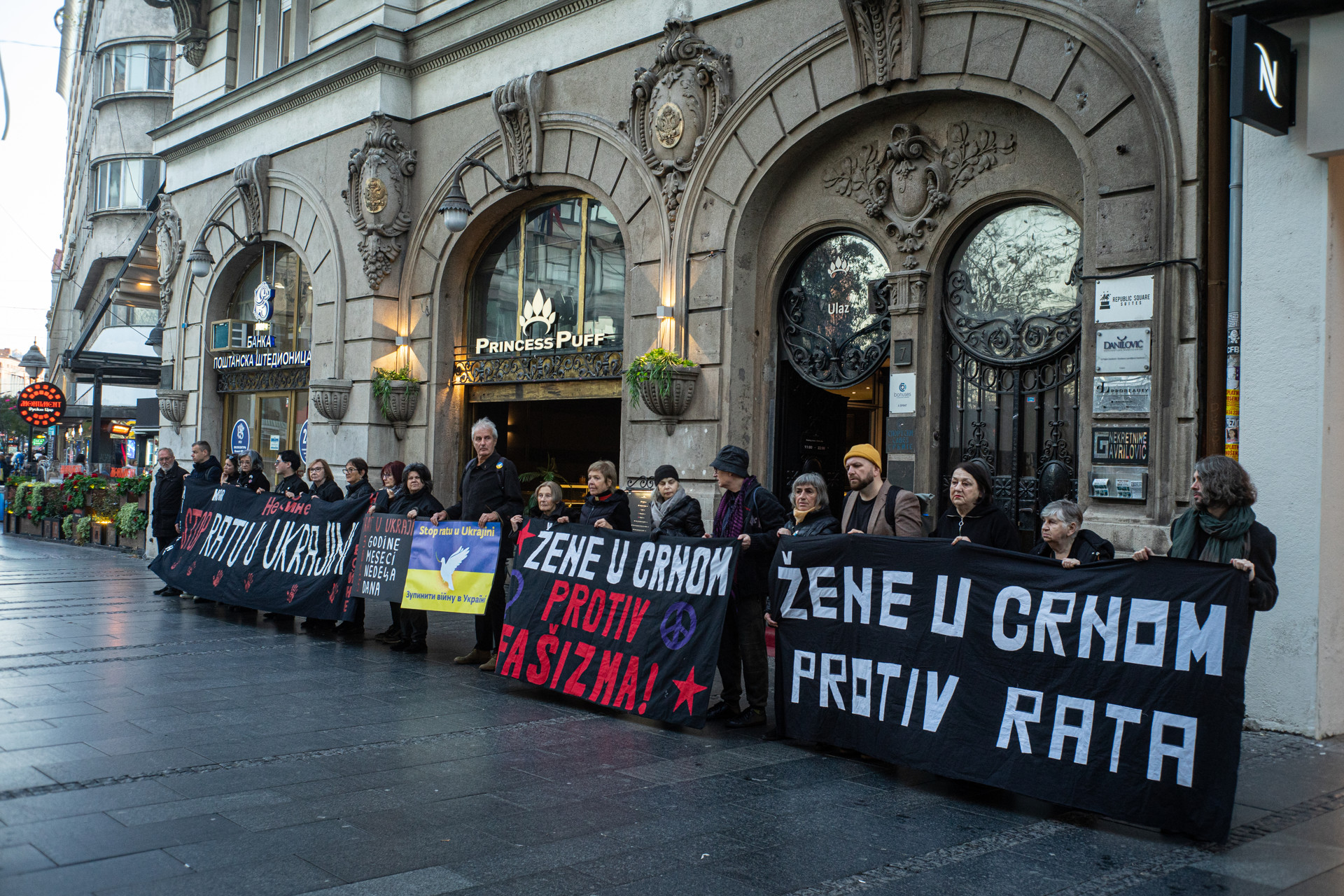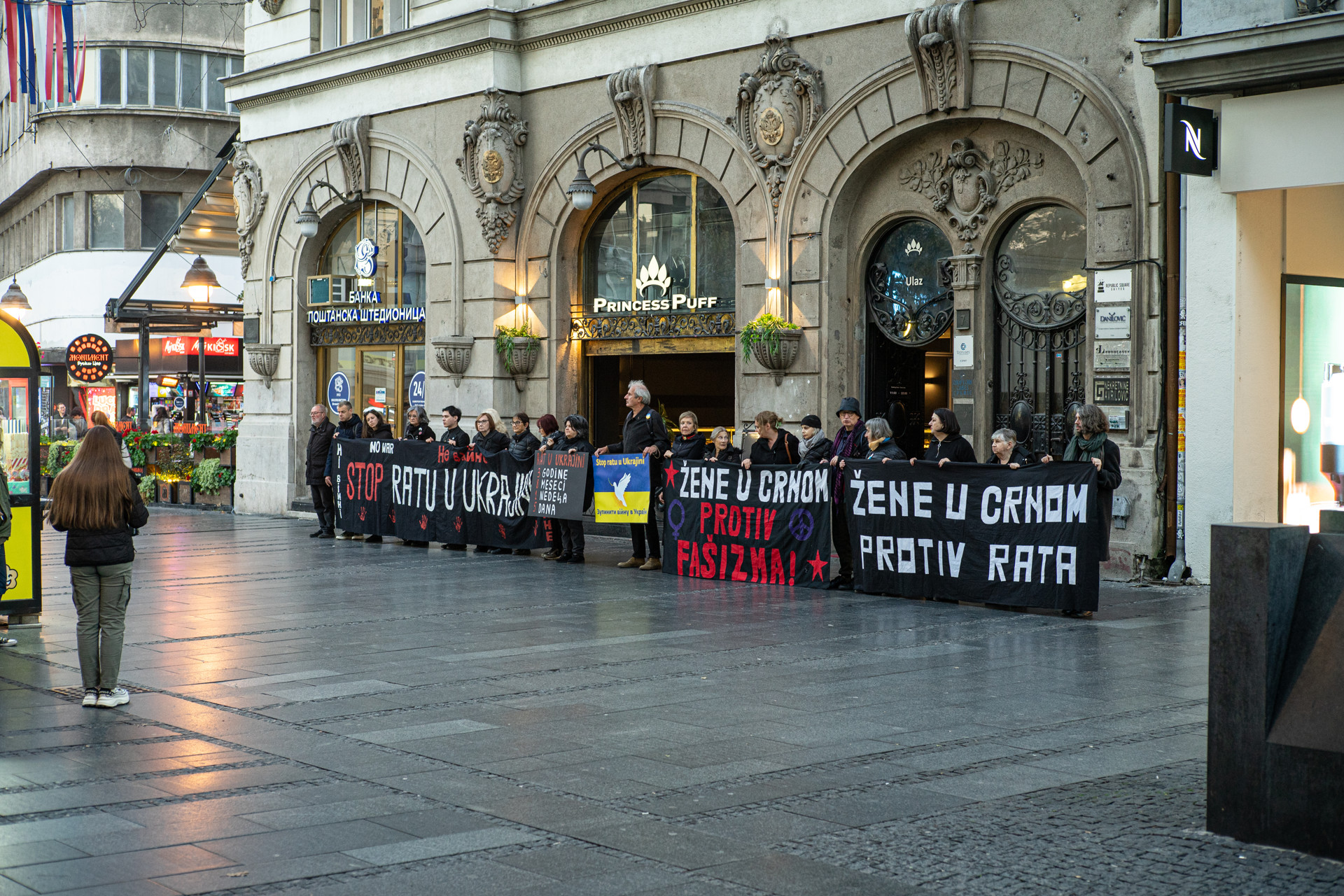 Žene u crnom su 05. novembra 2025. godine, u Knez Mihailovoj ulici, u Beogradu, u crnini i ćutanju, održale protest Stop ratu u Ukrajini.